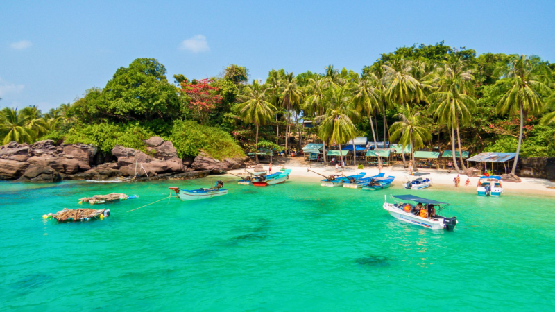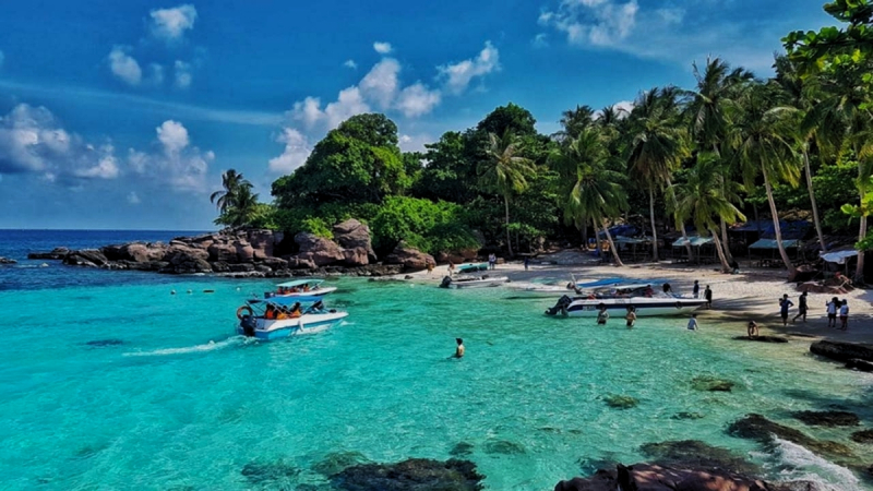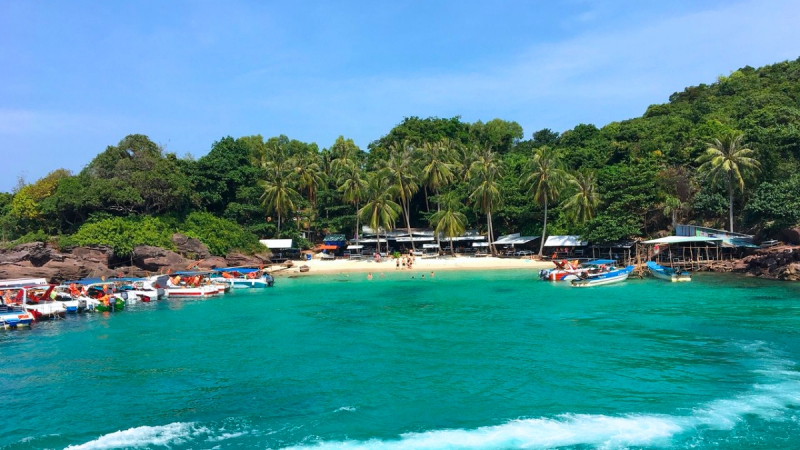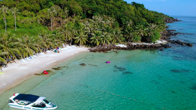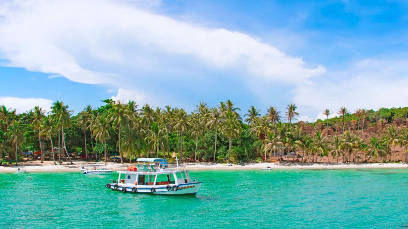 - 1st stop: Finger Nails Island, is an island located south of Phu Quoc island, famous for its wild beauty due to few people living there. When we come here, we'll get to swim in the crystal-clear blue waters of a stunning white beach.