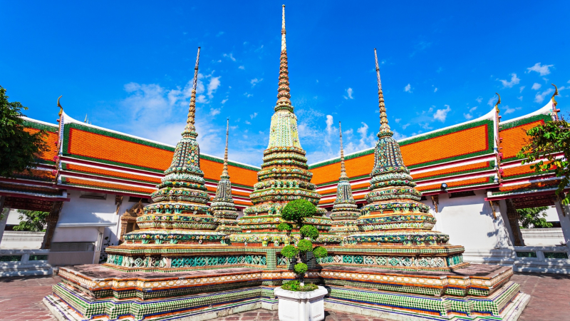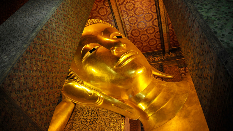 Wat Pho , entre los templos más extensos y antiguos de Bangkok, conocidos como el Templo del Buda reclinado. Aquí, puede maravillarse con el intrincado diseño de la estatua de Buda reclinable única hecha de oro, luego deambular por los vastos terrenos que acomodan más de 1,000 imágenes de Buda.