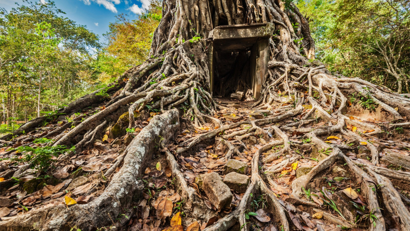 TA PROHM templo. Las higueras y las enredaderas gigantescas habían recuperado los cimientos de piedra de la estructura, haciendo una belleza entrelazada única entre la creación y la naturaleza humana, dejando una impresión indeleble en los visitantes.