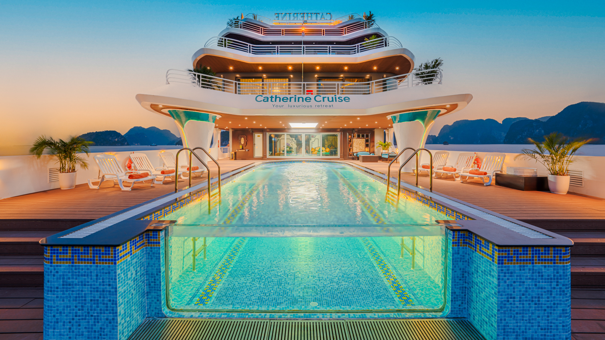 Inaugurado en 2023, el crucero Catherine es un crucero de 5 estrellas, moderno y lujoso, que navega por la maravillosa bahía de Ha Long. Inspirado en la delicada belleza de las mujeres del Sudeste Asiático, este barco de estilo indochino ofrece a sus huéspedes una atmósfera elegante y sofisticada.