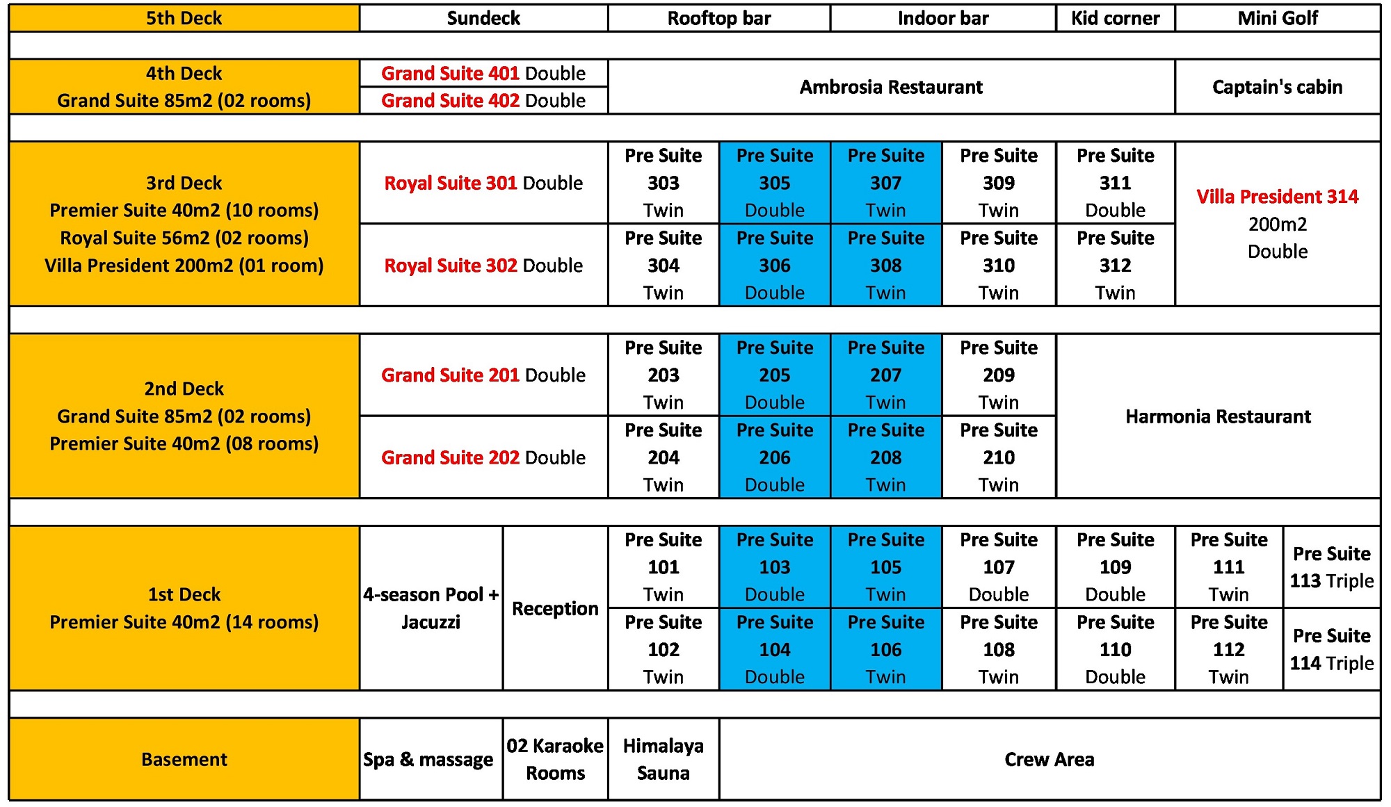 - Diversas zonas de entretenimiento y relax: karaoke, spa, sauna en la cubierta inferior, piscina en la primera cubierta...