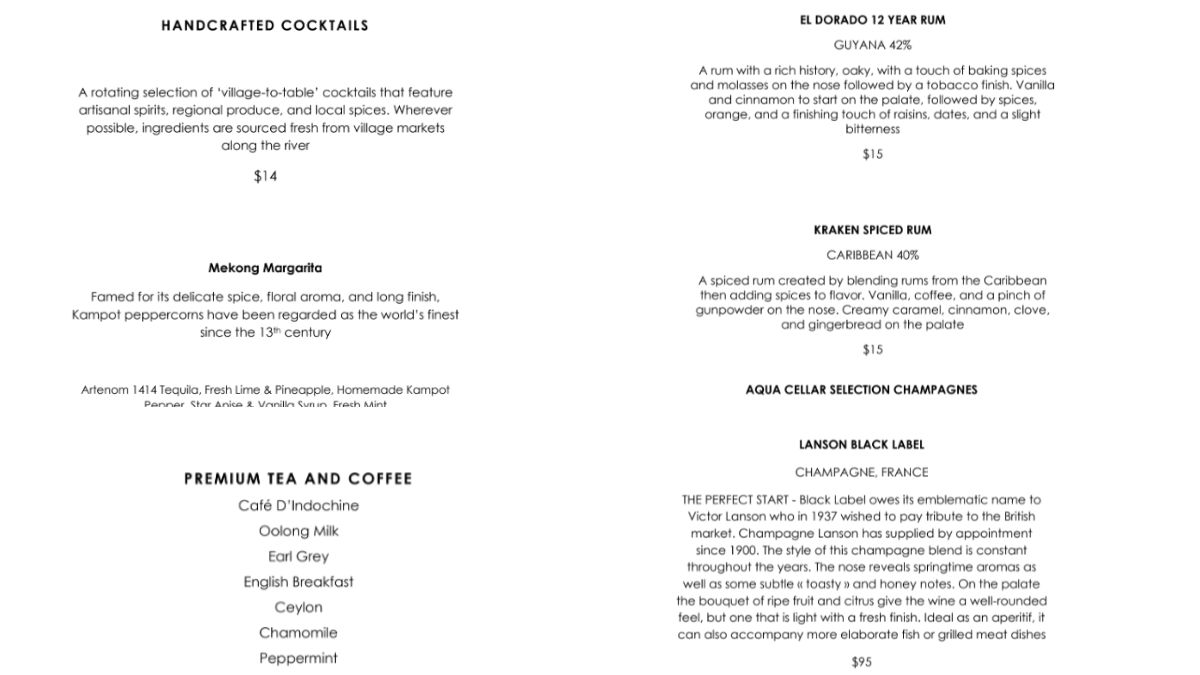 El Aqua Mekong es una presencia notable en el río Mekong, liderando el camino en cruceros de lujo en Camboya y Vietnam. A bordo del Aqua Mekong, los huéspedes disfrutan de un viaje culinario curado por el chef con estrella Michelin David Thompson, y el menú del bar diseñado por Proof & Co puede ofrecer a los pasajeros sabores locales.